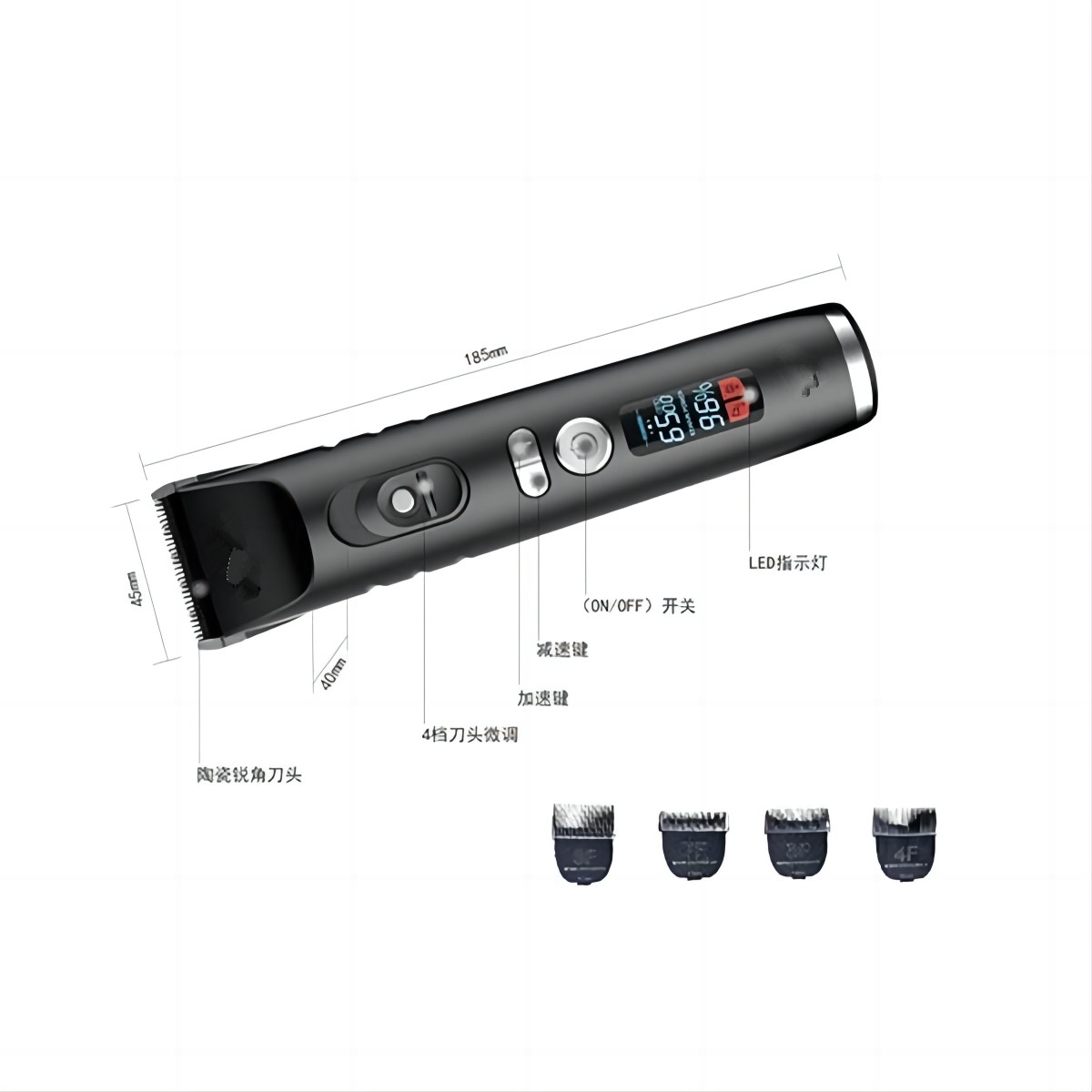 • Taispeánann an scáileán LED ard-sainmhínithe leibhéal na ceallraí i bhfíor-am, rud a chuireann cosc ar bhriseadh cumhachta le linn grooming agus ag cinntiú seirbhísí grooming baile nó salon níos míne.